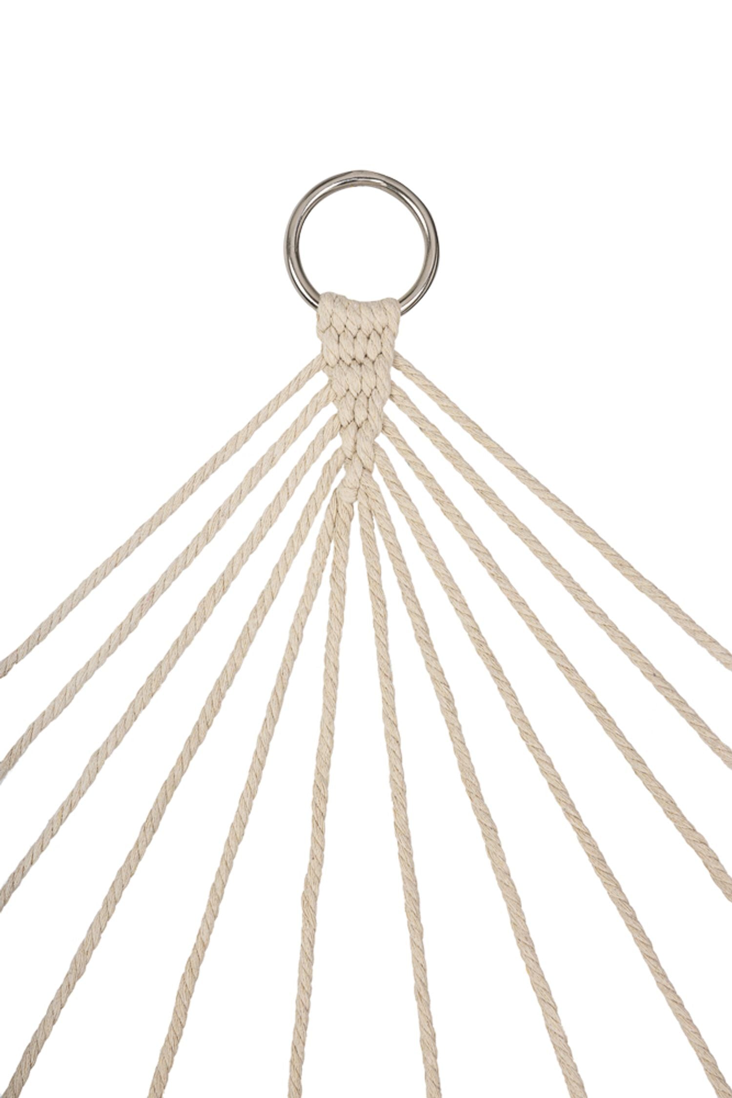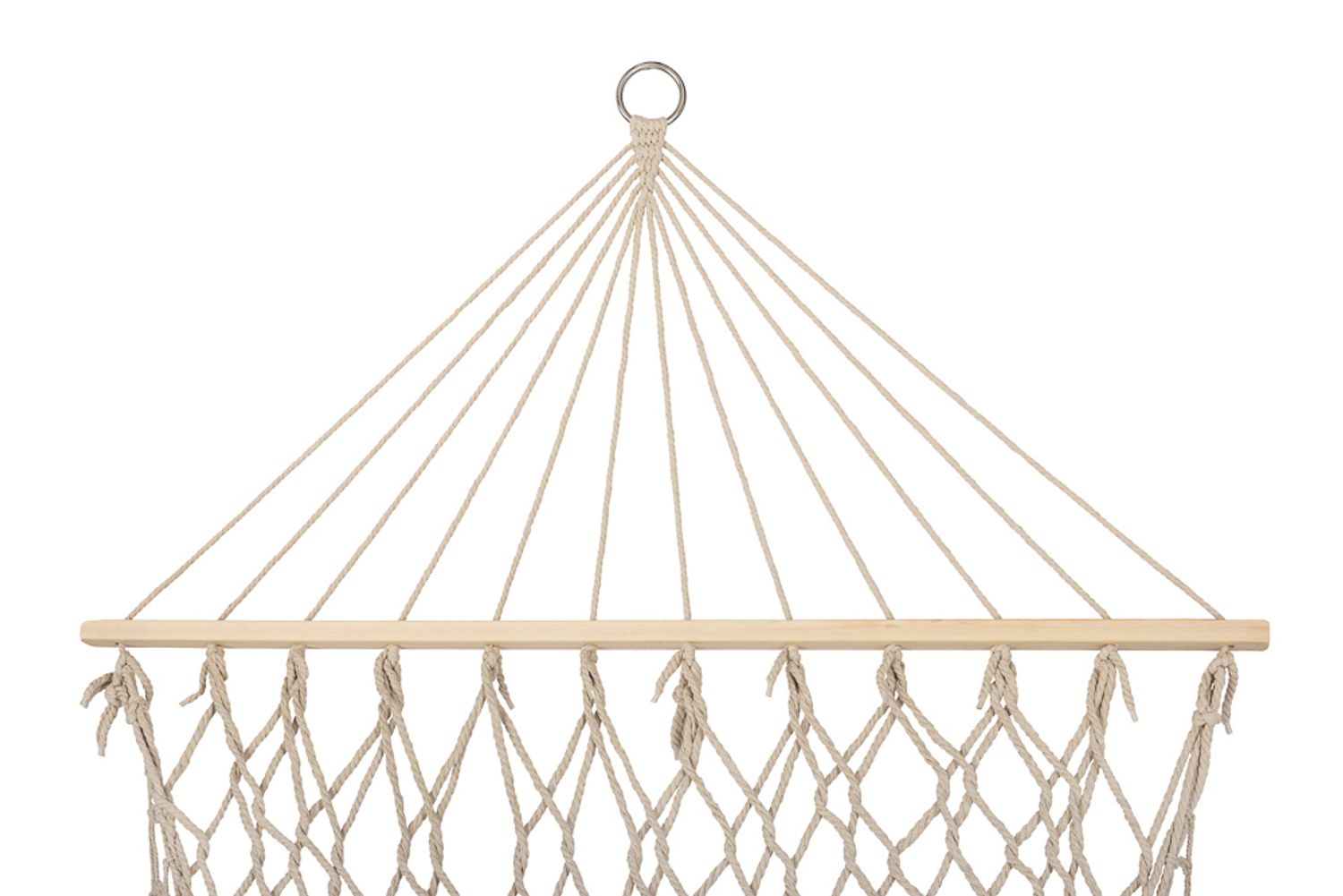 Hamak wykonany jest z grubo plecionych bawełnianych (65%) lin, co zapewnia mu wysoką wytrzymałość. Bez problemu udźwignie ciężar do 250 kilogramów. Jasny, beżowy kolor i frędzle na brzegach nadają mu elegancki wygląd, który doskonale wpasuje się w każdą ogrodową aranżację. Hamak jest zawieszony na drewnianym stelażu o szerokości 100 centymetrów, co zapewnia odpowiednią stabilność i komfort użytkowania. Po zwinięciu zajmuje niewiele miejsca, co ułatwia jego przechowywanie.